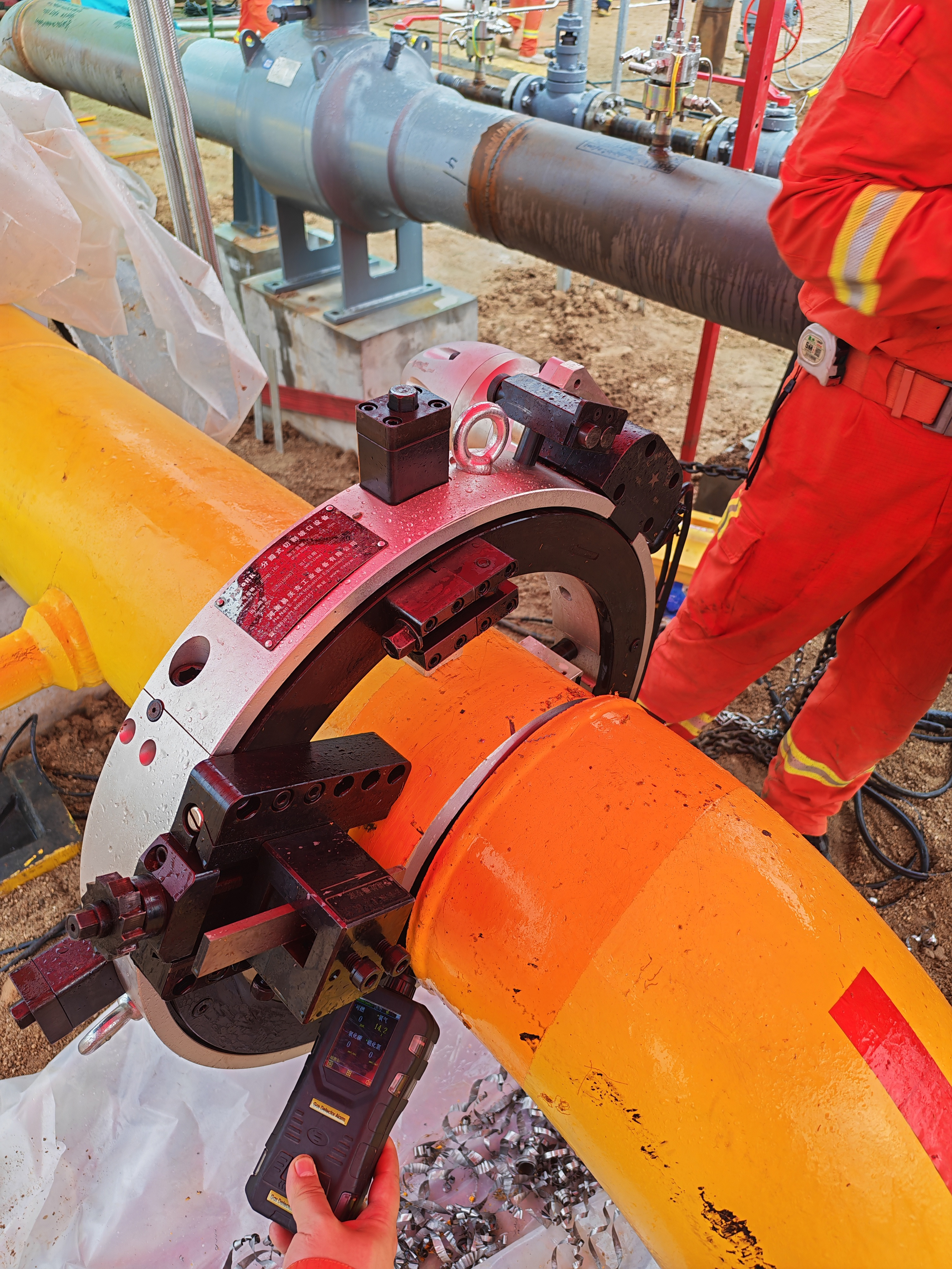 作業(yè)區(qū)域:管道冷切割切除原彎頭,拆除13米DN250管段。焊接2道彎頭焊口,并和新建分輸支路管線連接,作業(yè)點(diǎn)高度0.8米,采用易沃克分瓣式切割坡口機(jī)現(xiàn)場(chǎng)斷管作業(yè)