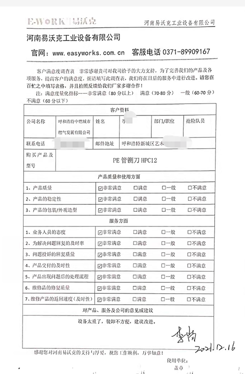 當(dāng)月呼和浩特中燃公司收到易沃克PE管鍘刀后立即開始現(xiàn)場燃?xì)釶E管切割搶修現(xiàn)場,現(xiàn)場工人師傅反饋使用后贊不絕口,這個易沃克廠家的PE管鍘刀質(zhì)量和效率真不錯,十多分鐘就可以帶氣切割大大提供現(xiàn)場搶修PE管切割時間,而且燃?xì)夤艿缼釶E管切割操作,現(xiàn)場師傅說前幾年一直用的美國進(jìn)口PE管鍘刀,想不到我們國產(chǎn)易沃克PE管鍘刀效果這樣好我們易沃克廠家的售后服務(wù)團(tuán)隊(duì)跟蹤一直在跟進(jìn)使用效果以及現(xiàn)場視頻免費(fèi)技術(shù)指導(dǎo),下面是燃?xì)夤艿垃F(xiàn)場PE管鍘刀使用效果反饋圖 和售后的服務(wù)評價表