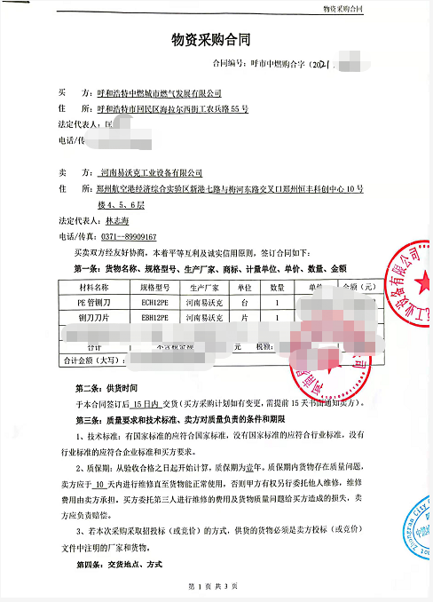 2021年10月份呼和浩特中燃燃?xì)饧瘓F(tuán)有限公司采購?fù)踅?jīng)理與我們河南易沃克工業(yè)設(shè)備有限公司業(yè)務(wù)員進(jìn)行電話溝通洽談了解易沃克產(chǎn)品主要服務(wù)于燃?xì)?、石油石化現(xiàn)場管道搶修、手動防爆冷切割刀、PE管止氣封堵、PE管鍘刀和PE管刮皮刀等搶修設(shè)備比較感興趣,經(jīng)過多次電話溝通確認(rèn)易沃克廠家產(chǎn)品比較符合中燃燃?xì)猬F(xiàn)場PE管切割搶修,在10月8號兩家公司簽訂PE管鍘刀采購合同。