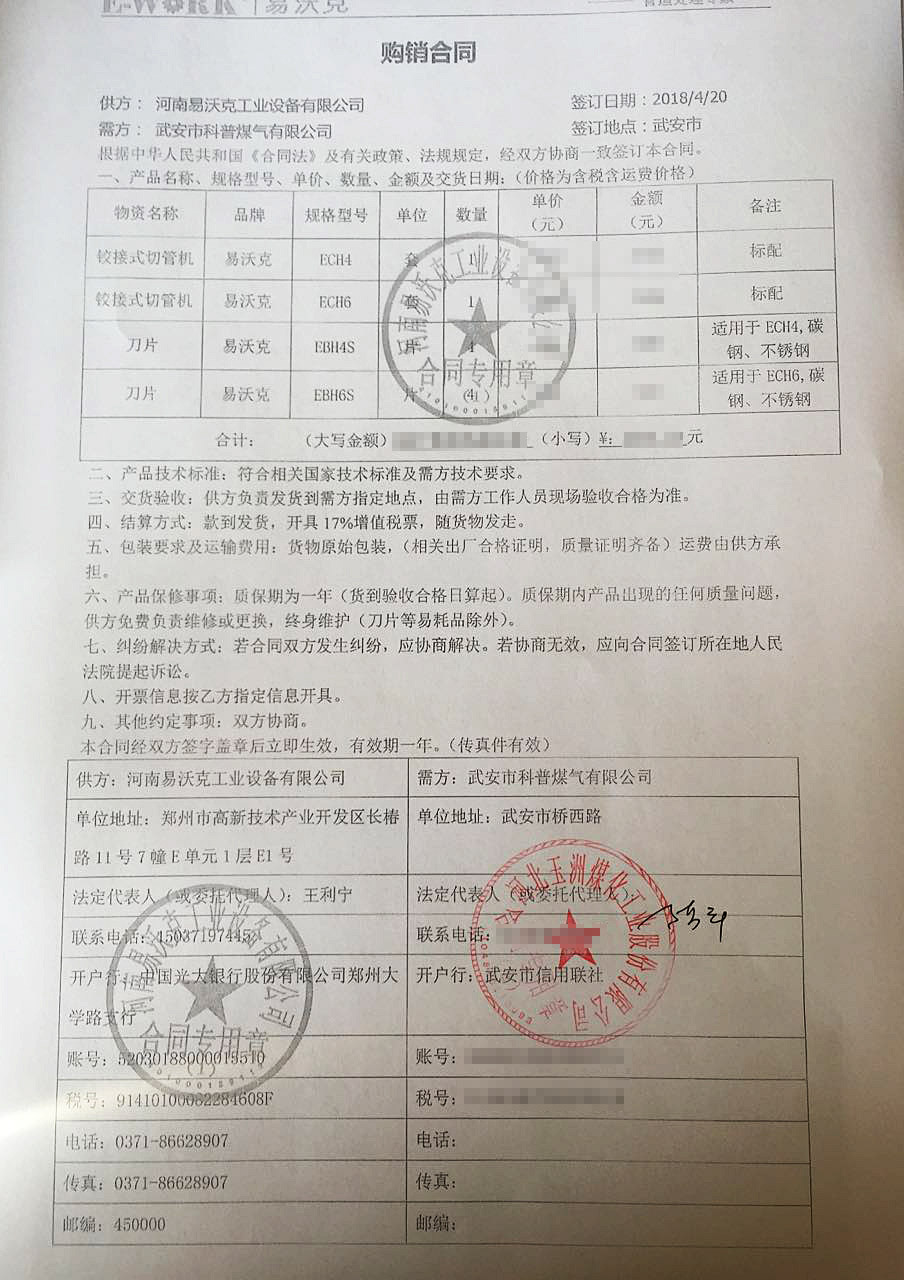 2018武安市科普煤氣公司購買我公司鉸接式切管機(jī)2套